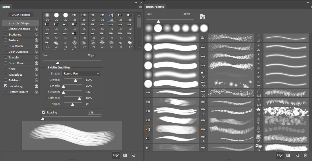Brushes/Options: The Brushes Palette allows you to select the shape and size of the paintbrush, airbrush, pencil, eraser and other tools. The Options Palette allows you to make choices about the attributes, appearance, or behavior of most tools. It is possible to create Photoshop brushes of your own design. Use the rectangle Marquee with Feather set to 0 to select part of an image to use as a custom brush. The brush shape can be anything up to 2500 x 2500 pixels in size. Brushes use grayscle data to determine how the pigment will be laid down. Remember that anywhere black in the brush will render at 100% of pigment - but not necessarly the darkest. Choosing a light pigment means that sections darkest in the brush will render lightest in your brush stroke. If you want to create a brush with soft edges, choose brush shapes composed of grayscale data rather than pure black. Choose Define Brush Preset from the Edit Menu. Name the brush and click OK. In the New Brush dialog box, specify Spacing and other parameters. |