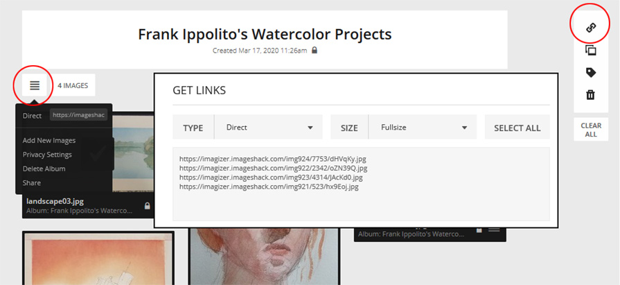 NOTE: To send me the link or links for your work, there are two options. a) The chain link GET LINKS icon on the upper right allows you to select and right-click-copy any links to one or more images. Or b) Clicking on the menu icon in the upper left of image field reveals a small black drop down menu. Click into the Direct link at its top to select and copy the link for the whole album. Use this last method for this week's upload so I can see all work at once. Afterwards you can use either method. Paste these links into an email and send it to me to hand in homework. |