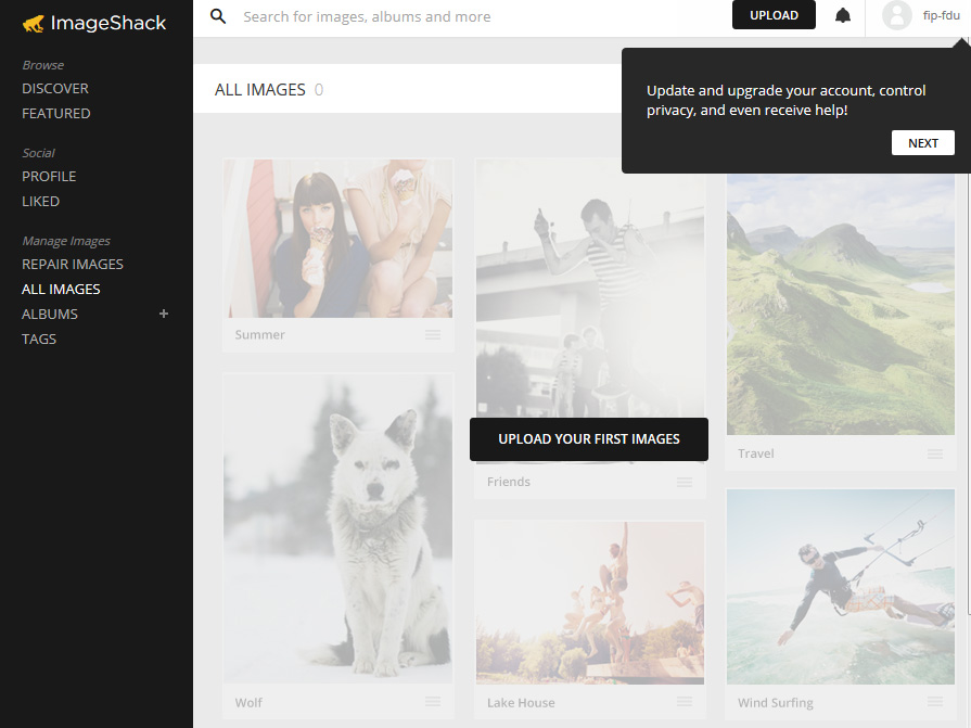 ![]() Arriving for the first time at ImageShack (https://www.imageshack.us/) you will need to use the yellow Sign Up button in the upper right of the welcome page. To continue, you will be asked for simple data - email, user name, and password. After verifying your email by replying to one that is sent out to you, you will return and be offered a 1/2 price yearly promo. Unless you think you will like to keep an image hosting account beyond the end of the semester, Skip This Step. You will next arrive at the home page for your account and will see a tag in upper right that points to the corner where you can later update your account. Cycling through the Next buttons will show you locations for a couple more features. Do this so it will disappear and unclutter your view. |