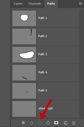 Once the path is completed and refined, the path can be turned into a selection using the dotted circle icon at the bottom of the Path Palette. One can also Ctrl + Click on the path layer icon in the Path Palette to activate the selection. This will be true for any layer-style palette, such as Layers and Channels. This selection (or any selection created by any means) can then be further edited by switching to the Quickmask mode. The Quickmask mode is entered by hitting the Q key. Any selection active at that moment will now be represented by a transparent red shape. This shape can be edited using any of the paint brushes, erasers, and filters. (note: while in Quickmask you cannot edit the layer itself, only the selection) Hitting Q again exits Quickmask and returns to the standard selection which can then used as a frisket for a paintbrush, to mask a filter, or as a template to cut a shape into the layer.