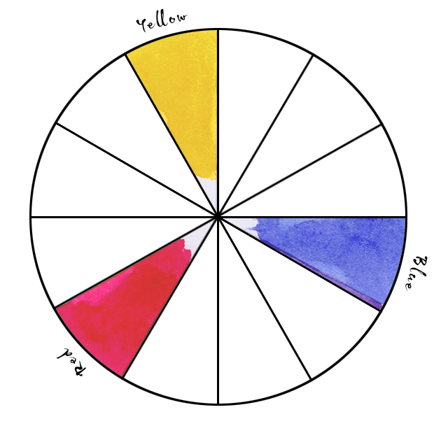 We will start with our warm color wheel. Do not attempt to do both at once, as you will need the entire mixing palette by the time you finish each wheel.