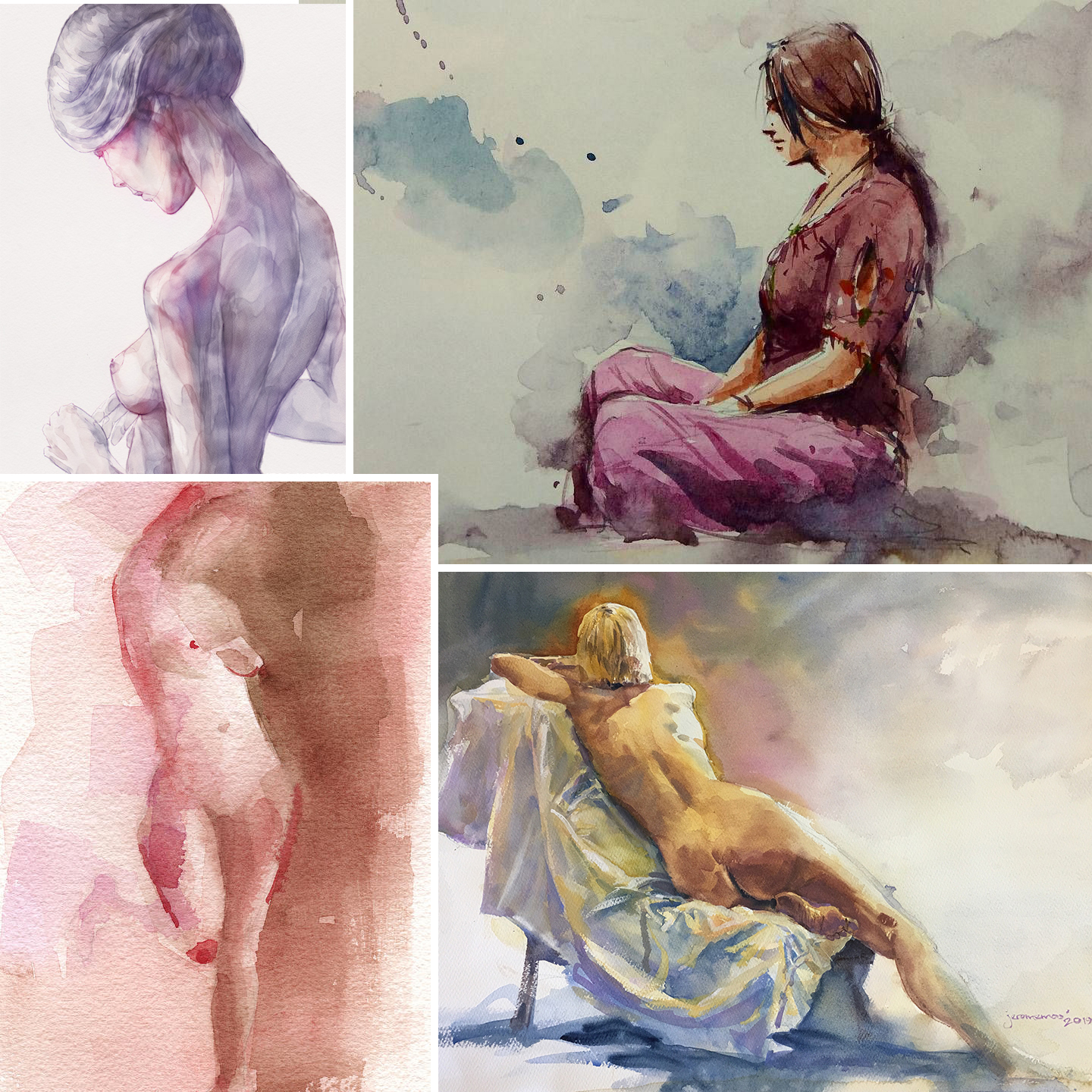 The loose, expressive nature of watercolor lends itself to capturing a wide range of moods and emotions of the human form - from the dramatic energy of a fleeting pose to the subtle, sensual play of shadow and light on bare skin. The medium sets itself apart with its nuance, immediacy, and vibrance.