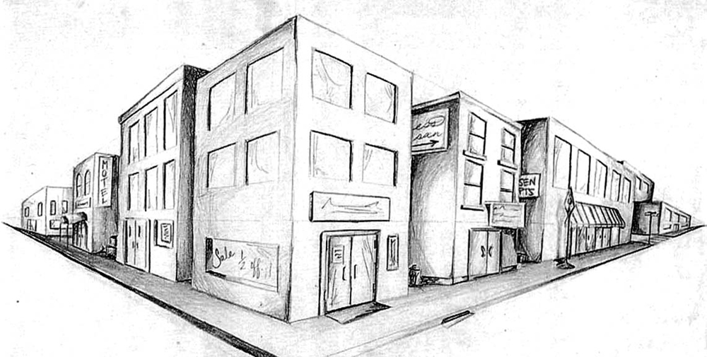 When drawing building and other structures in your scene, remember this simple rule of 2 Point Perspective: The top and bottom edges of walls, doors, and windows all point either up or down towards the horizon, depending on where they sit in your scene. Edges that are above the horizon slope downward; edges that are below the horizon slope upward. These both converge at the horizon line in a spot called the Vanishing Point. To capture this accurately, first establish the horizon in the landscape and draw it lightly across the paper. Now follow an obvious roofline or other edge towards that line. Place a dot there. Do so in each of the 2 directions - you will have a small dot on the horizon line at each side of the paper. Now all of the top and bottom edges should aim directly at those points, as shown in the example above. Mouse over image to see the basic framework drawn out in daigram. |