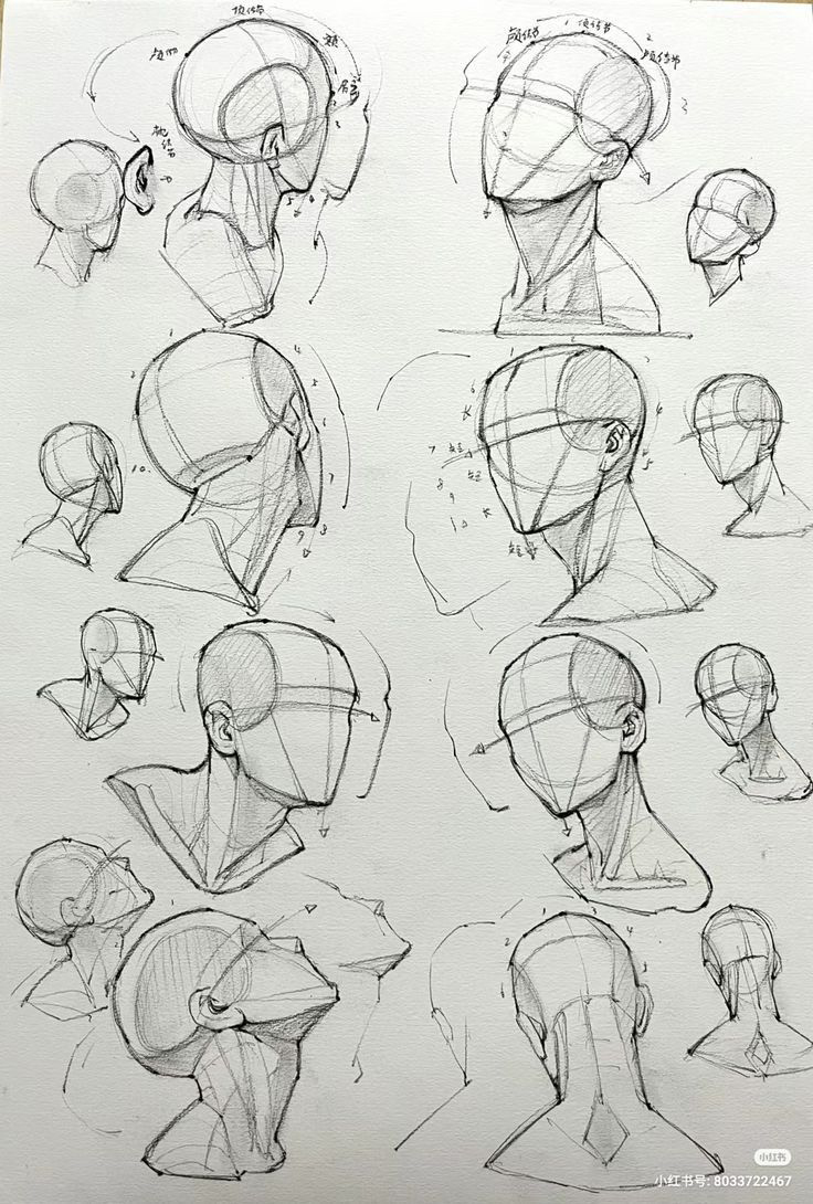 Drawing the Head, Neck, and Shoulders It's important to remember that the head is not just propped atop a simple cylinder that ermerges up from the body. The neck is a complex, dynamic structure that needs a bit of study to really appreciate just what is happening as the head is moved in even the simplest of ways. First note how the rotation point between the head and neck sits in the lower skull, just behind the ear. The study on the lower left shows this quite clearly, but you can see it throughout these sudies.