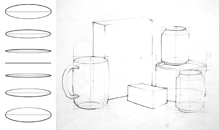 It is important to recognize that objects that are circular in cross-section, such as a cylinder, will only be perfectly round when seen from above. How it is seen in most circumstances is more eliptical. The shape of the elipse is dictated by how it is tipped relative to our viewpoint. The closer to a topmost viewpoint will be closest to circular. When seen on edge of our viewpoint, it will be a straight line. All angles tipped between these two points will be somewhere in between. Use this information to learn how to see - and ultimately to see - the cylinders in your subject matter. |