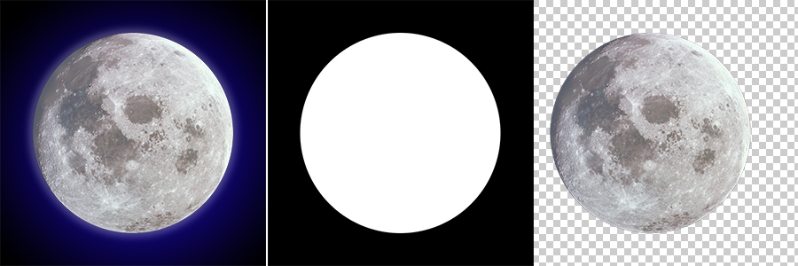 The Power of Masking AE notes the transparency of every single footage file it handles. If the file already has an Alpha Channel embedded within, then AE will ask how to interpret it. If the file has no Alpha, then AE will add a completely white mask - one that reveals ALL pixels fully, corner to corner. In an Alpha Channel, any area that is black will cause the corresponding area in the footage to be transparent. Any area that is pure white will be fully opaque. And any area that is a grade of grayscale (x 256 levels) will introduce an area transparent of that percentage. Fullmoon.tif has an embedded Alpha channel that defines the area outside the sphere. Interpreted correctly, this mask is used to block any pixels that are not the moon itself. |