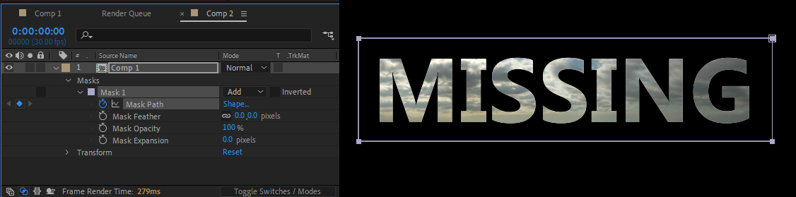 A mask can be animated to allow text or other footage to become revealed or otherwise change in shape. To animate a mask, first apply the mask to a layer. In the Timeline, scroll down and twirl open the sub-track for Mask (this appears as soon as you add one.) Along with Mask Feather, you will find Mask Path. Hit the Stopwatch to animate Mask Path and proceed to adjust the anchor points of the mask over time to make the mask shape evolve. As always, be sure to follow the keyframe workflow and move the Timeline Cursor and then adjust the propery for each change you want. |