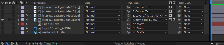 Track Mattes allow for great control over how a layer will be seen in a Comp. To access the Track Matte drop-down for a layer, be sure that the Transfer Control Pane is visible (the 2nd switch from left in the lowest left corner should be blue.) As of the most recent version of AE, a Track Matte can be taken from any track within the comp. Use the Track Matte drop-down to point to the matte layer you chose. Once a track is defined as a Track Matte, its eyeball is turned off and it is not longer visible. This default state may not be desirable, in which case you must locat it and reactivate the layer. The icon to the right of the drop-down defines whether the matte is based on Alpha or Luma data of the target layer. The 2nd icon switches to Inverse masking. |