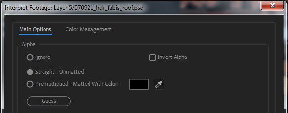 Interpreting Alpha When opening an image that has an Alpha Channel embedded within it, AE needs to know how to handle the data. A dialog box will pop up to clarify this point. An incorrect choice here will often result in an object with a light or dark halo around it. (AE is pretty good at guessing the correct setting, so if you are unsure... try hitting the Guess button first.) If there is no need for the mask, then tell AE to ignore the channel. If you want AE to use the alpha, straight is the more common option and should be your first guess. Premultiplied includes a color swatch that can be used to isolate a background color. Files that have been rendered within a 3D program will often have the background color bleed around its edge pixels. Black is the most common background color in these cases. |