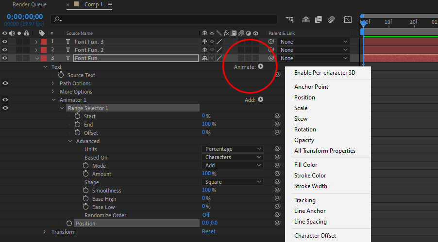 Animating Text To find the full power of text animation, twirl down the Text Layer properties in the Timeline and find the little white Animate Text arrow. Clicking on this drop-down will reveal a number of specialized animation tools for the layer, called Animators. Click one to apply it to your Text Layer. New porperties will now be seen under your layer. These can now be twirled down to reveal the true workings of text animation in AE. All of the standard transforms can be animated this way, along with text-specific properties such as Spacing, Text Color, and Tracking. The real power here can be found with the Range Selector, which can be used to limit which character within a word - or words within a phrase - will be affected by the Animator. The fact that the properties of the Range Selector itself can be animated means that text effected by the Animator can evolve over time, leading to animated text effects that can range from the subtle to the totally wild. . |