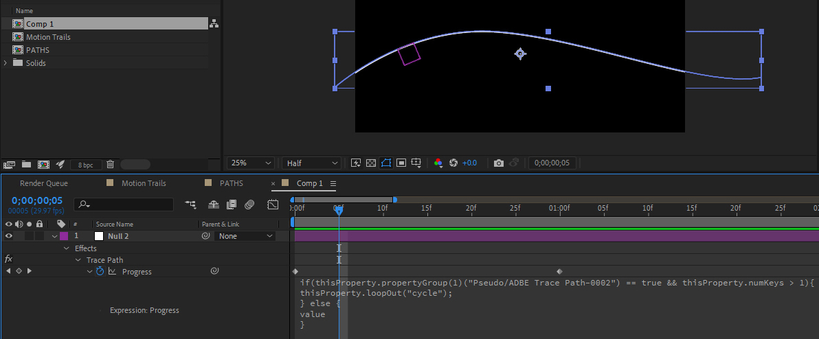 ADD A TRACE PATH: In a Comp that is 1080p in size and 10 seconds long, draw a line using the Pen Tool that arcs across the scene left to right. In the Timeline select the Path and open the Contents arrow and below that the Shape and Path 1 twirl downs. Select Path so all 3 are highlighted. While selected, go to the Window menu along the top white menu bar and locate Create Null From Paths.jsx at the bottom. Select it. Chose the Trace Path option from the pop-up. This will create a new Null Object and place it on the path, and use the Path as a Motion Path. Scroll the Timeline Cursor to see the results. In the Timeline, select the Null Object and open the effects track to find the Trace Path Progress parameter (as shown above.) Highlight the entire set of script lines that start with "if(thisProperty..." and ends with the } bracket and delete all of it. This will stop the effect from looping. Create a Shape Layer (Circle or Star) or import your choice of footage that will follow the Null. While the new Shape Layer is selected, go to Menu > Layer > Transform > Center Anchor Point in Layer Content. Click the Pickwhip of the Shape Layer and hold Shift while dragging down to the name of the Null layer. This will snap the shape layer to the Null Path. Scroll timeline to see results. To speed up or slow down the results, move the 2nd keyframe as necessary. ADD A GROWING TAIL TO THE FLYING FOOTAGE: Add a Trim Path to the Line track. Open the Trim Path track and Pickwhip the End Value to the Null's Progress track. This will create a visible Motion Trail that emerges from the animated Shape. NOTE: You can use this approach to slave a Particular Particle emitter to that same Null Progress Track. To do so, open the Emitter section in the Particular Effects Control Panel and choose the (now renamed) Null layer in the drop-down menu for the property "Linked Null." |