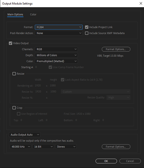 RENDERING To render a comp, highlight the Comp window or Timeline within your project and hit the shortcut CTRL + M. The Render Queue window opens and temporarily covers the Timeline tab. Here you will see three links in hot blue. It is there that you modify the various settings for each render. If you are planning to render only a short section of the project or change the render to half-size, adjust these settings via the Best Settings link. If you see "Current Settings" instead of "Best Settings," be sure to check in on these parameters. As we sometimes leave the "current setting" to a lower quality render, you should always set to Best for the final output. Click on the blue Lossless next to OUTPUT MODULE. In the Output Module settings, set the FORMAT as H.264. The last change you must make is to review the file name and the Output_To location. You are now ready to hit the RENDER button (on far right of render queue) and await the results. After rendering is finished, AE will sound a chime (watch your headphone volume!) Double click the new file to view. Sometimes the movie will play back a bit jerky the first time through. This is especially true of full res video with embedded audio. Allow playback to finish and watch a second time to get a better sense of the playback quality. NOTE: Always review the rending output before uploading for review! What you hand in is what will be graded. |